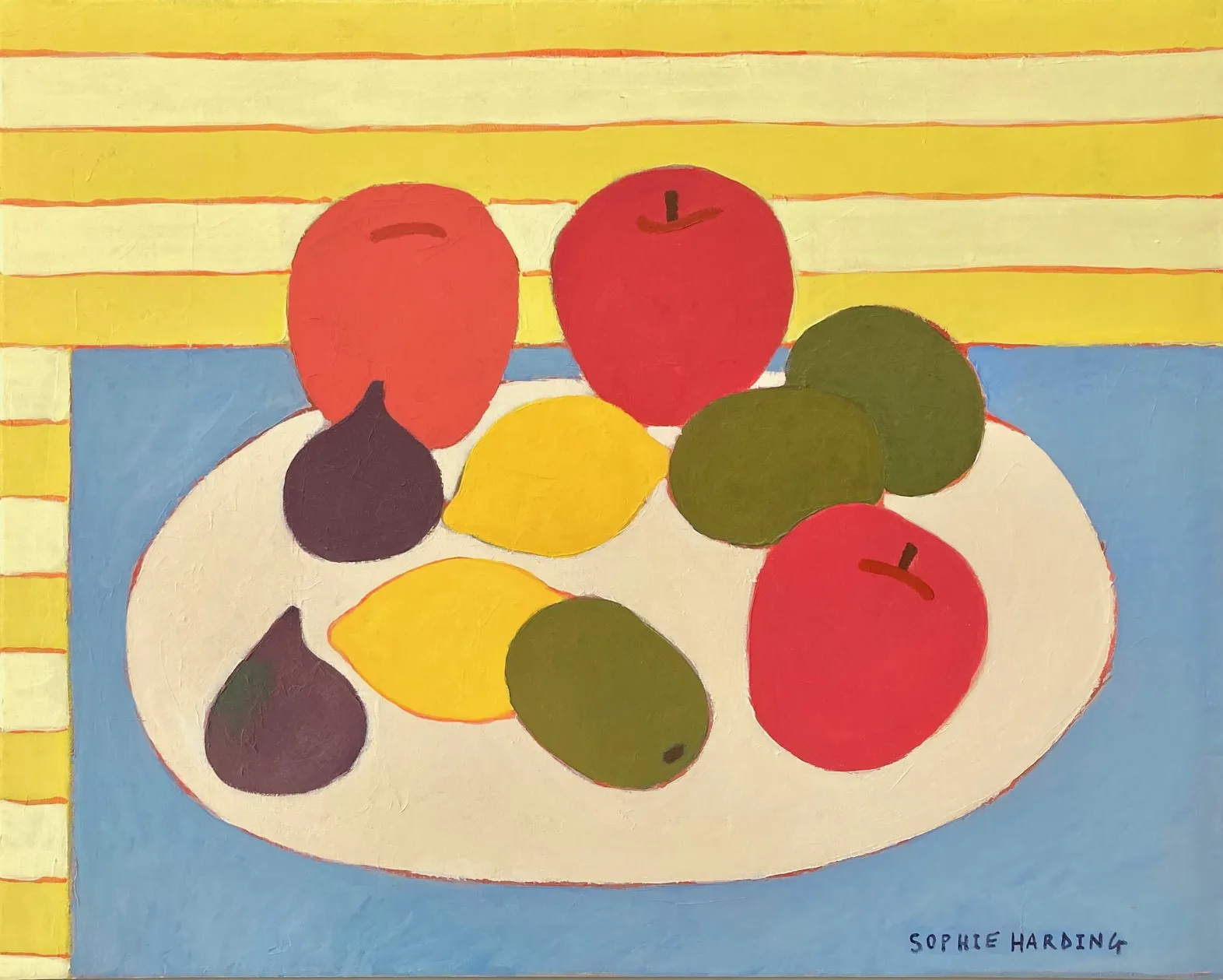There is a confident economy to Sophie's compositions that rewards close looking. Forms are reduced to their defining shapes: a jug becomes a bold silhouette, a lemon a perfect curve of saturated yellow. Backgrounds are treated as fields of colour rather than described spaces, allowing the objects themselves to hold the viewer's attention with clarity and presence. This apparent simplicity is the result of considerable skill and experience. Sophie trained in Fashion and Textile Design at Central Saint Martins and has worked as a painter, illustrator and designer for over three decades, creating imagery for clients ranging from Liberty London to Airbnb. That deep understanding of composition, pattern and the communicative power of bold, clean forms runs through every painting she makes.